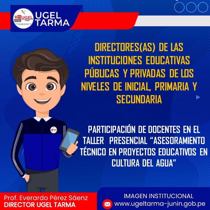 UGEL – TARMA Inicio Nosotros Historia Misión, Visión Directorio Telefónico Documento de Gestión Contacto Convocatorias Contratación CAS Contrato Docente 2022 Contrato de Auxiliares 2022 Reasignación Docente y Auxiliares Documentos de Gestión Directivas Oficios Comunicados Servicios Mesa de Partes Virtual (SISDORE) Consulta el estado de tu expediente Descargar FUT Libro de Reclamaciones Portal de Transparencia TALLER PRESENCIAL “ASESORAMIENTO TÉCNICO EN PROYECTOS EDUCATIVOS EN CULTURA DEL AGUA” COMENTARIOS UNIDAD DE GESTIÓN EDUCATIVA LOCAL TARMA Dirección: Psj. San Juan Bosco N° 102 Tarma Central telefónica: (064) 323082 Mesa de Partes: (064) 321718 Email: ugel2020tarma@gmail.com Facebook Twitter Youtube