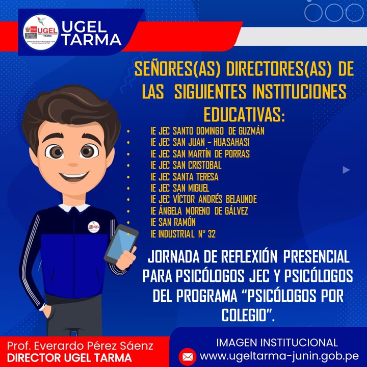 UGEL – TARMA Inicio Nosotros Historia Misión, Visión Directorio Telefónico Documento de Gestión Contacto Convocatorias Contratación CAS Contrato Docente 2022 Contrato de Auxiliares 2022 Reasignación Docente y Auxiliares Documentos de Gestión Directivas Oficios Comunicados Servicios Mesa de Partes Virtual (SISDORE) Consulta el estado de tu expediente Descargar FUT Libro de Reclamaciones Portal de Transparencia Jornada de reflexión presencial para psicólogos JEC y para psicólogos del programa “Psicólogos por Colegio” COMENTARIOS UNIDAD DE GESTIÓN EDUCATIVA LOCAL TARMA Dirección: Psj. San Juan Bosco N° 102 Tarma Central telefónica: (064) 323082 Mesa de Partes: (064) 321718 Email: ugel2020tarma@gmail.com Facebook Twitter Youtube