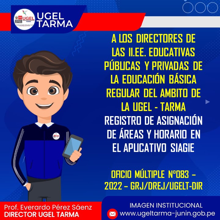 UGEL – TARMA Inicio Nosotros Historia Misión, Visión Directorio Telefónico Documento de Gestión Contacto Convocatorias Contratación CAS Contrato Docente 2022 Contrato de Auxiliares 2022 Reasignación Docente y Auxiliares Documentos de Gestión Directivas Oficios Comunicados Servicios Mesa de Partes Virtual (SISDORE) Consulta el estado de tu expediente Descargar FUT Libro de Reclamaciones Portal de Transparencia REGISTRO DE ASIGNACIÓN DE ÁREAS Y HORARIO EN EL APLICATIVO SIAGIE COMENTARIOS UNIDAD DE GESTIÓN EDUCATIVA LOCAL TARMA Dirección: Psj. San Juan Bosco N° 102 Tarma Central telefónica: (064) 323082 Mesa de Partes: (064) 321718 Email: ugel2020tarma@gmail.com Facebook Twitter Youtube