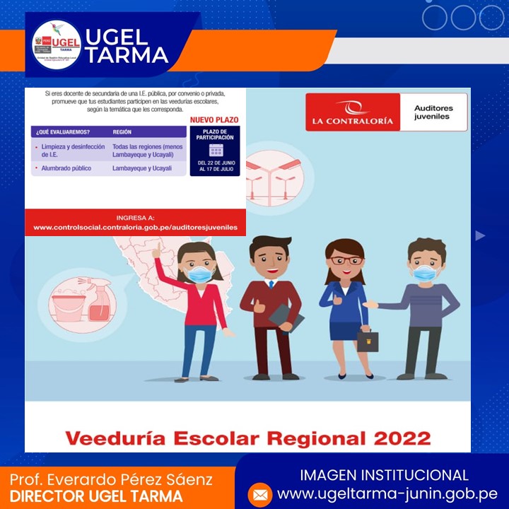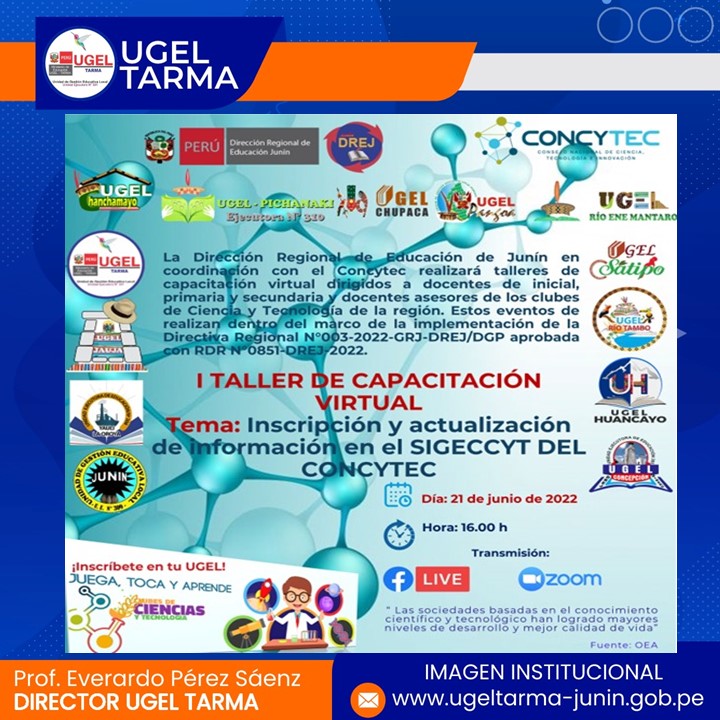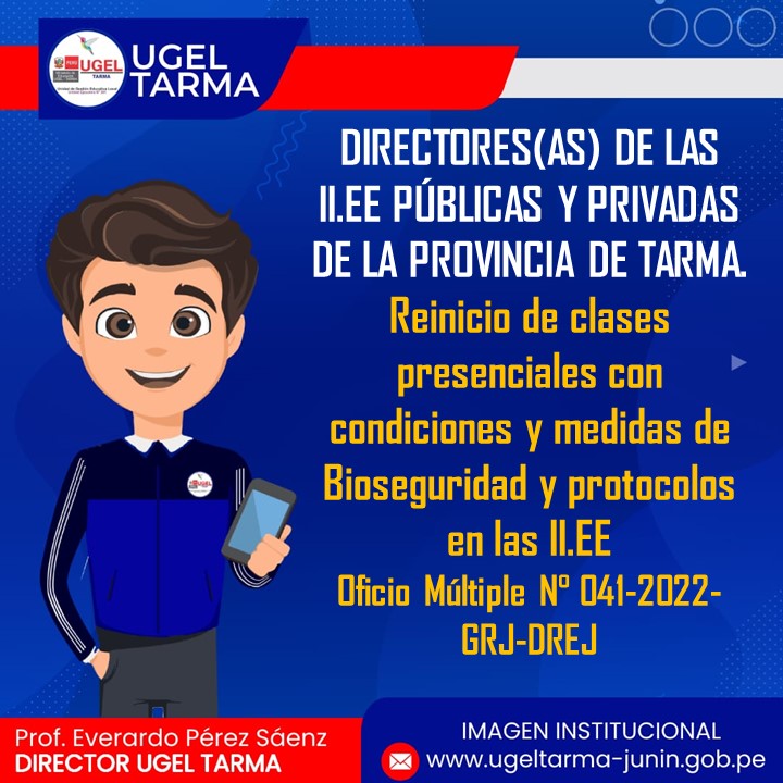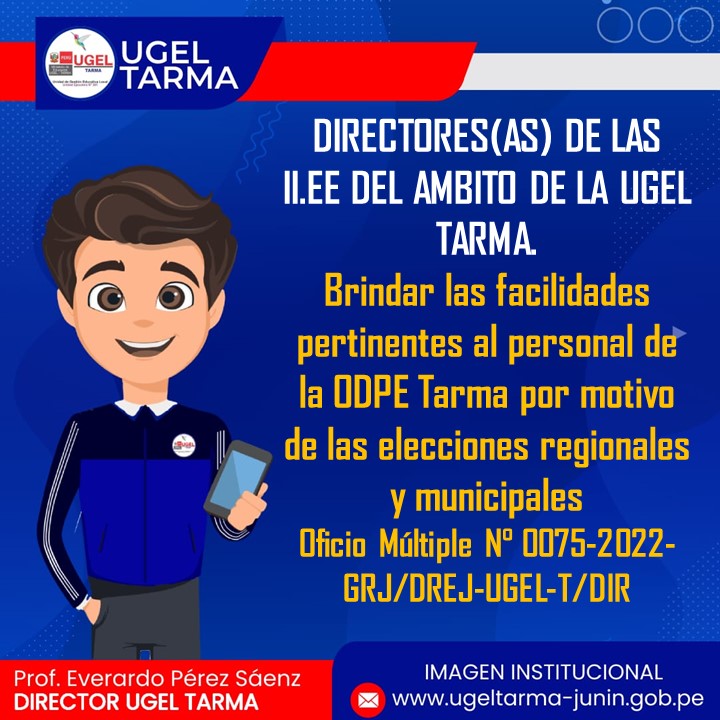 UGEL – TARMA Inicio Nosotros Historia Misión, Visión Directorio Telefónico Documento de Gestión Contacto Convocatorias Contratación CAS Contrato Docente 2022 Contrato de Auxiliares 2022 Reasignación Docente y Auxiliares Documentos de Gestión Directivas Oficios Comunicados Servicios Mesa de Partes Virtual (SISDORE) Consulta el estado de tu expediente Descargar FUT Libro de Reclamaciones Portal de Transparencia Brindar las facilidades pertinentes al personal de la ODPE Tarma por motivo de las elecciones regionales y municipales COMENTARIOS UNIDAD DE GESTIÓN EDUCATIVA LOCAL TARMA Dirección: Psj. San Juan Bosco N° 102 Tarma Central telefónica: (064) 323082 Mesa de Partes: (064) 321718 Email: ugel2020tarma@gmail.com Facebook Twitter Youtube