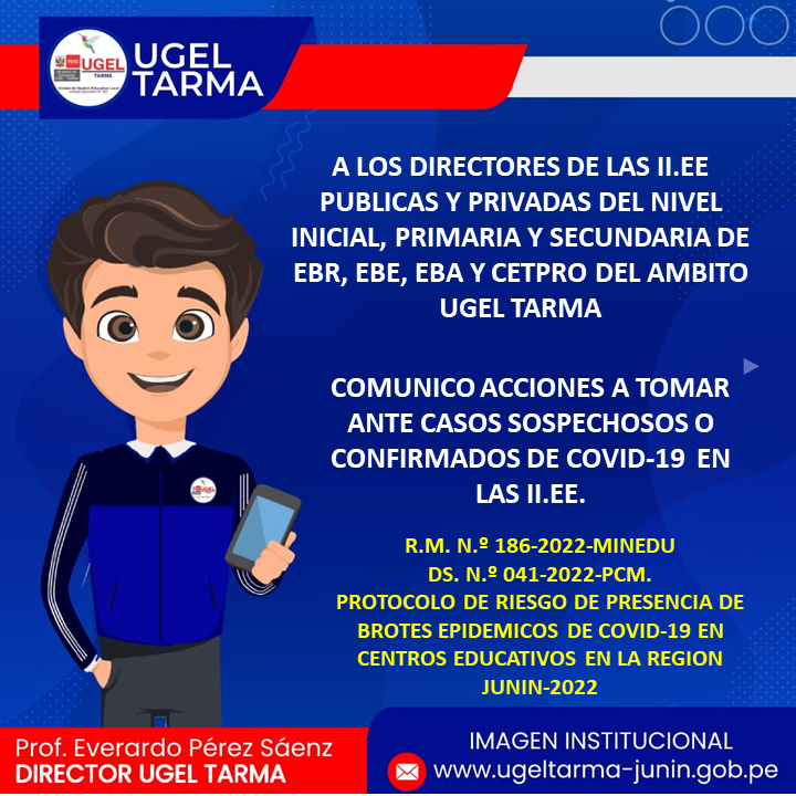 UGEL – TARMA Inicio Nosotros Historia Misión, Visión Directorio Telefónico Documento de Gestión Contacto Convocatorias Contratación CAS Contrato Docente 2022 Contrato de Auxiliares 2022 Reasignación Docente y Auxiliares Documentos de Gestión Directivas Oficios Comunicados Servicios Mesa de Partes Virtual (SISDORE) Consulta el estado de tu expediente Descargar FUT Libro de Reclamaciones Portal de Transparencia Reinicio de clases presenciales con condiciones y medidas de Bioseguridad y protocolos en las II.EE COMENTARIOS UNIDAD DE GESTIÓN EDUCATIVA LOCAL TARMA Dirección: Psj. San Juan Bosco N° 102 Tarma Central telefónica: (064) 323082 Mesa de Partes: (064) 321718 Email: ugel2020tarma@gmail.com Facebook Twitter Youtube