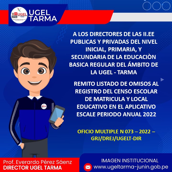 UGEL – TARMA Inicio Nosotros Historia Misión, Visión Directorio Telefónico Documento de Gestión Contacto Convocatorias Contratación CAS Contrato Docente 2022 Contrato de Auxiliares 2022 Reasignación Docente y Auxiliares Documentos de Gestión Directivas Oficios Comunicados Servicios Mesa de Partes Virtual (SISDORE) Consulta el estado de tu expediente Descargar FUT Libro de Reclamaciones Portal de Transparencia LISTADO DE OMISOS AL REGISTRO DEL CENSO ESCOLAR DE MATRICULA Y LOCAL EDUCATIVO EN EL APLICATIVO ESCALE PERIODO ANUAL 2022 COMENTARIOS UNIDAD DE GESTIÓN EDUCATIVA LOCAL TARMA Dirección: Psj. San Juan Bosco N° 102 Tarma Central telefónica: (064) 323082 Mesa de Partes: (064) 321718 Email: ugel2020tarma@gmail.com Facebook Twitter Youtube