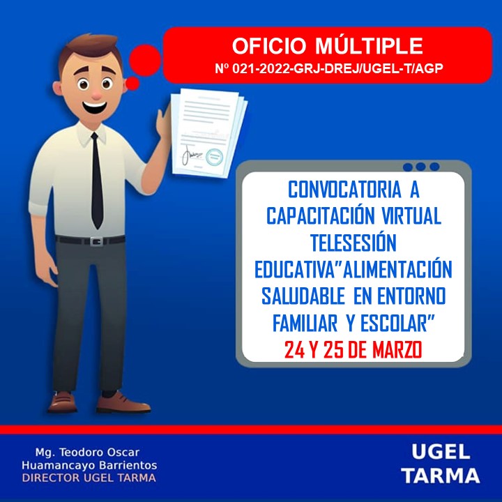 UGEL – TARMA Inicio Nosotros Historia Misión, Visión Directorio Telefónico Documento de Gestión Contacto Convocatorias Contratación CAS Contrato Docente 2022 Contrato de Auxiliares 2022 Reasignación Docente y Auxiliares Documentos de Gestión Directivas Oficios Comunicados Servicios Mesa de Partes Virtual (SISDORE) Consulta el estado de tu expediente Descargar FUT Libro de Reclamaciones Portal de Transparencia CONVOCATORIA A CAPACITACIÓN VIRTUAL TELESESIÓN EDUCATIVA”ALIMENTACIÓN SALUDABLE EN ENTORNO FAMILIAR Y ESCOLAR” COMENTARIOS UNIDAD DE GESTIÓN EDUCATIVA LOCAL TARMA Dirección: Psj. San Juan Bosco N° 102 Tarma Central telefónica: (064) 323082 Mesa de Partes: (064) 321718 Email: ugel2020tarma@gmail.com Facebook Twitter Youtube