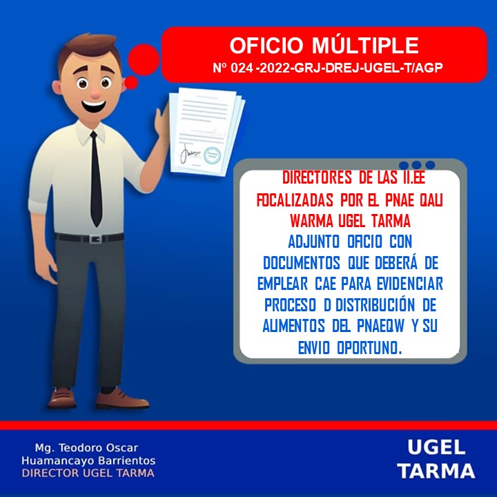 DIRECTORES DE LAS II.EE FOCALIZADAS POR EL PNAE QALI WARMA UGEL TARMA ADJUNTO OFICIO CON DOCUMENTOS QUE DEBERÁ DE EMPLEAR CAE PARA EVIDENCIAR PROCESO D DISTRIBUCIÓN DE ALIMENTOS DEL PNAEQW Y SU ENVIO OPORTUNO.