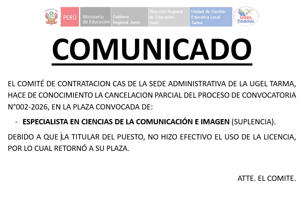 COMUINICADO PROCESO DE CONVOCATORIA CAS N°002-2026 – SEDE