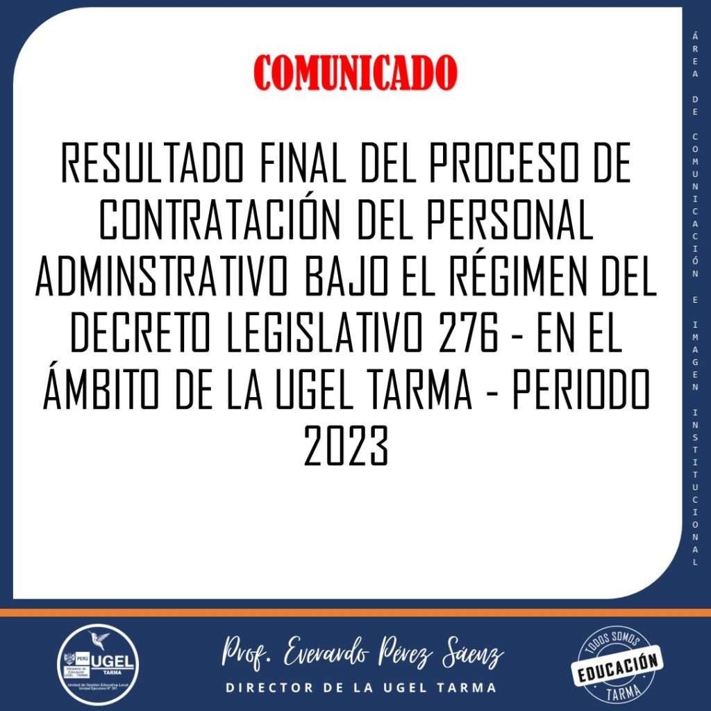 RESULTADO FINAL DEL PROCESO DE CONTRATACIÓN DEL PERSONAL ADMINSTRATIVO BAJO EL RÉGIMEN DEL DECRETO LEGISLATIVO 276 – EN EL ÁMBITO DE LA UGEL TARMA – PERIODO 2023