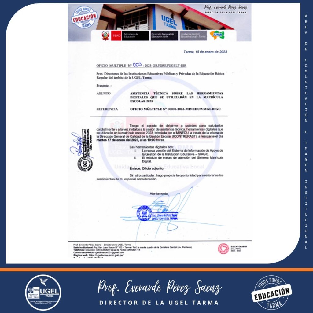 UGEL – TARMA Inicio Nosotros Historia Misión, Visión Directorio Telefónico Documento de Gestión Contacto Convocatorias Contratación CAS Contrato Docente 2022 Contrato de Auxiliares 2022 Reasignación Docente y Auxiliares Documentos de Gestión Directivas Oficios Comunicados Servicios Mesa de Partes Virtual (SISDORE) Consulta el estado de tu expediente Descargar FUT Libro de Reclamaciones Portal de Transparencia RESULTADO FINAL DEL PROCESO DE CONTRATACIÓN DEL PERSONAL ADMINSTRATIVO BAJO EL RÉGIMEN DEL DECRETO LEGISLATIVO 276 – EN EL ÁMBITO DE LA UGEL TARMA – PERIODO 2023 UNIDAD DE GESTIÓN EDUCATIVA LOCAL TARMA Dirección: Psj. San Juan Bosco N° 102 Tarma Central telefónica: (064) 323082 Mesa de Partes: (064) 321718 Email: ugel2020tarma@gmail.com Facebook Twitter Youtube
