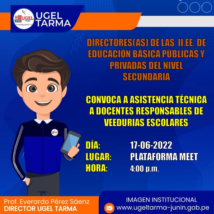 UGEL – TARMA Inicio Nosotros Historia Misión, Visión Directorio Telefónico Documento de Gestión Contacto Convocatorias Contratación CAS Contrato Docente 2022 Contrato de Auxiliares 2022 Reasignación Docente y Auxiliares Documentos de Gestión Directivas Oficios Comunicados Servicios Mesa de Partes Virtual (SISDORE) Consulta el estado de tu expediente Descargar FUT Libro de Reclamaciones Portal de Transparencia DIRECTORES(AS) DE LAS II.EE. DE EDUCACIÓN BÁSICA PÙBLICAS Y PRIVADAS DEL NIVEL SECUNDARIA COMENTARIOS UNIDAD DE GESTIÓN EDUCATIVA LOCAL TARMA Dirección: Psj. San Juan Bosco N° 102 Tarma Central telefónica: (064) 323082 Mesa de Partes: (064) 321718 Email: ugel2020tarma@gmail.com Facebook Twitter Youtube