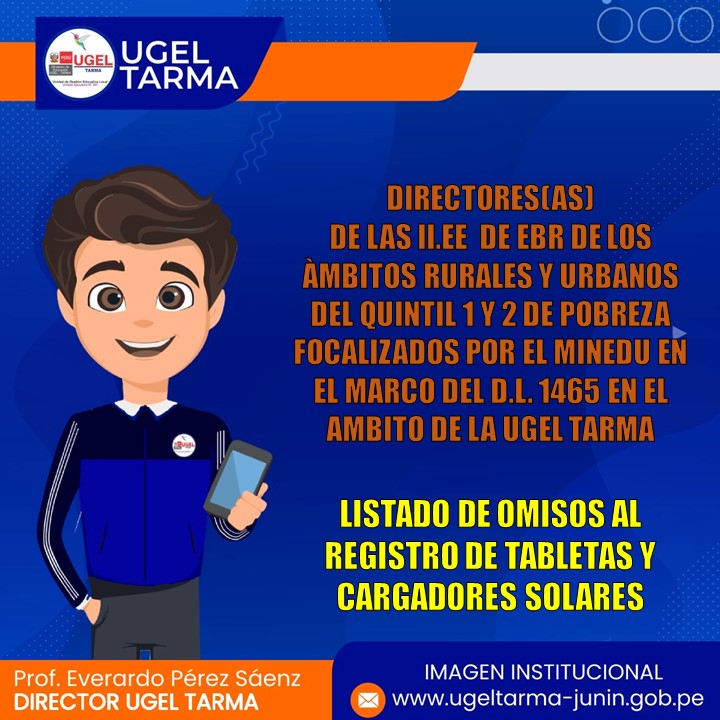 UGEL – TARMA Inicio Nosotros Historia Misión, Visión Directorio Telefónico Documento de Gestión Contacto Convocatorias Contratación CAS Contrato Docente 2022 Contrato de Auxiliares 2022 Reasignación Docente y Auxiliares Documentos de Gestión Directivas Oficios Comunicados Servicios Mesa de Partes Virtual (SISDORE) Consulta el estado de tu expediente Descargar FUT Libro de Reclamaciones Portal de Transparencia LISTADO DE OMISOS AL REGISTRO DE TABLETAS Y CARGADORES SOLARES . COMENTARIOS UNIDAD DE GESTIÓN EDUCATIVA LOCAL TARMA Dirección: Psj. San Juan Bosco N° 102 Tarma Central telefónica: (064) 323082 Mesa de Partes: (064) 321718 Email: ugel2020tarma@gmail.com Facebook Twitter Youtube