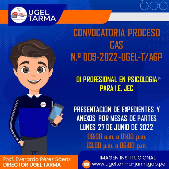 UGEL – TARMA Inicio Nosotros Historia Misión, Visión Directorio Telefónico Documento de Gestión Contacto Convocatorias Contratación CAS Contrato Docente 2022 Contrato de Auxiliares 2022 Reasignación Docente y Auxiliares Documentos de Gestión Directivas Oficios Comunicados Servicios Mesa de Partes Virtual (SISDORE) Consulta el estado de tu expediente Descargar FUT Libro de Reclamaciones Portal de Transparencia CONVOCATORIA CAS JEC N.º009 COMENTARIOS UNIDAD DE GESTIÓN EDUCATIVA LOCAL TARMA Dirección: Psj. San Juan Bosco N° 102 Tarma Central telefónica: (064) 323082 Mesa de Partes: (064) 321718 Email: ugel2020tarma@gmail.com Facebook Twitter Youtube