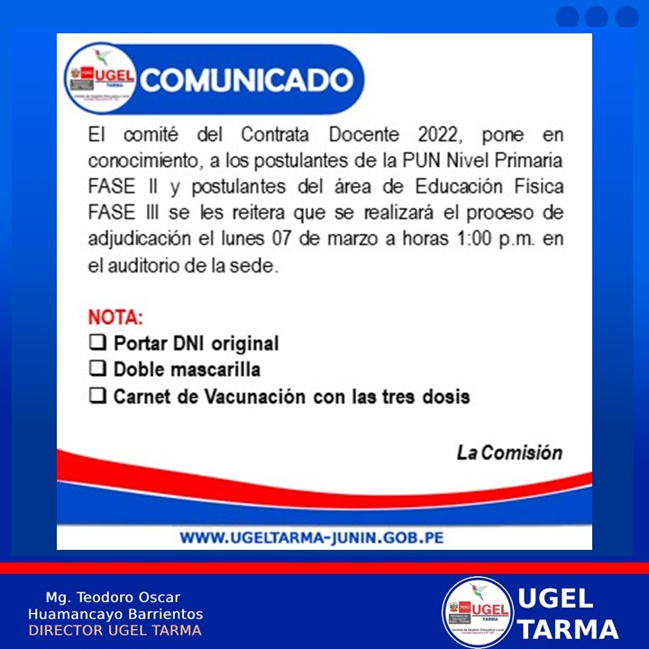 UGEL – TARMA Inicio Nosotros Historia Misión, Visión Directorio Telefónico Documento de Gestión Contacto Convocatorias Contratación CAS Contrato Docente 2022 Contrato de Auxiliares 2022 Reasignación Docente y Auxiliares Documentos de Gestión Directivas Oficios Comunicados Servicios Mesa de Partes Virtual (SISDORE) Consulta el estado de tu expediente Descargar FUT Libro de Reclamaciones Portal de Transparencia RESULTADO FINAL DE POSTULANTES A LOS PROCESOS DL 276 – 2022 COMENTARIOS UNIDAD DE GESTIÓN EDUCATIVA LOCAL TARMA Dirección: Psj. San Juan Bosco N° 102 Tarma Central telefónica: (064) 323082 Mesa de Partes: (064) 321718 Email: ugel2020tarma@gmail.com Facebook Twitter Youtube