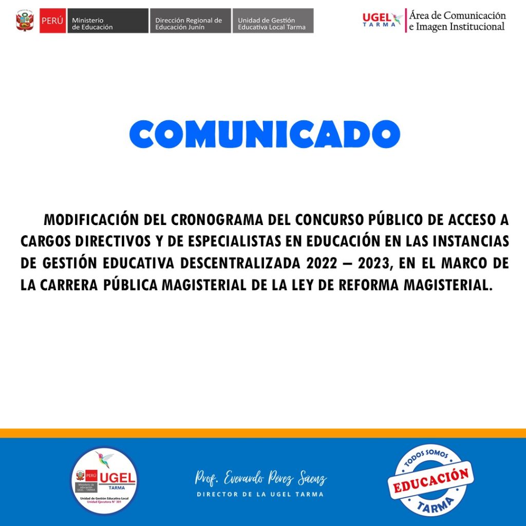 MODIFICACIÓN DEL CRONOGRAMA DEL CONCURSO PÚBLICO DE ACCESO A CARGOS DIRECTIVOS Y DE ESPECIALISTAS EN EDUCACIÓN EN LAS INSTANCIAS DE GESTIÓN EDUCATIVA DESCENTRALIZADA 2022 – 2023